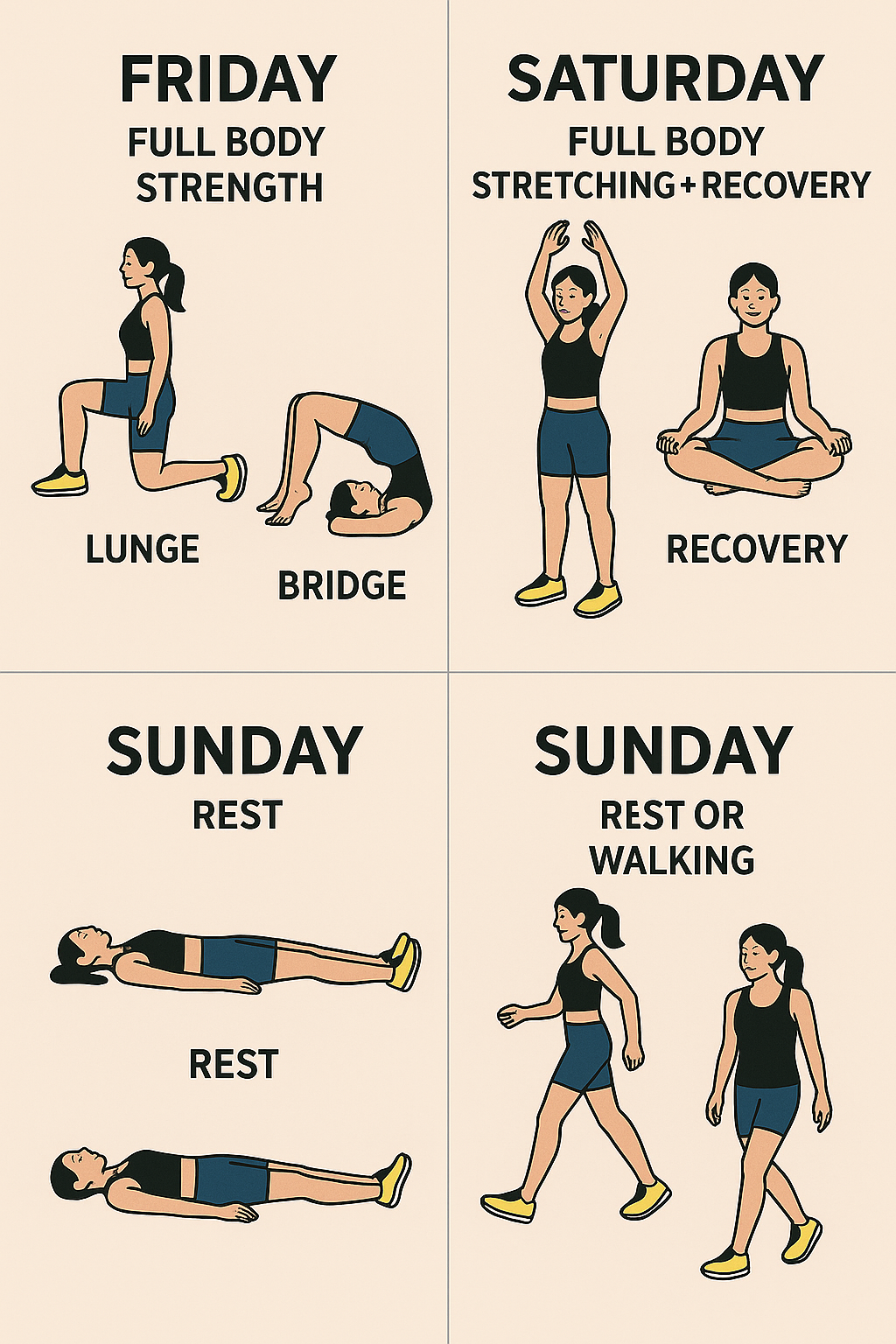 | 금요일 | 전신 근력 (런지, 브릿지) |