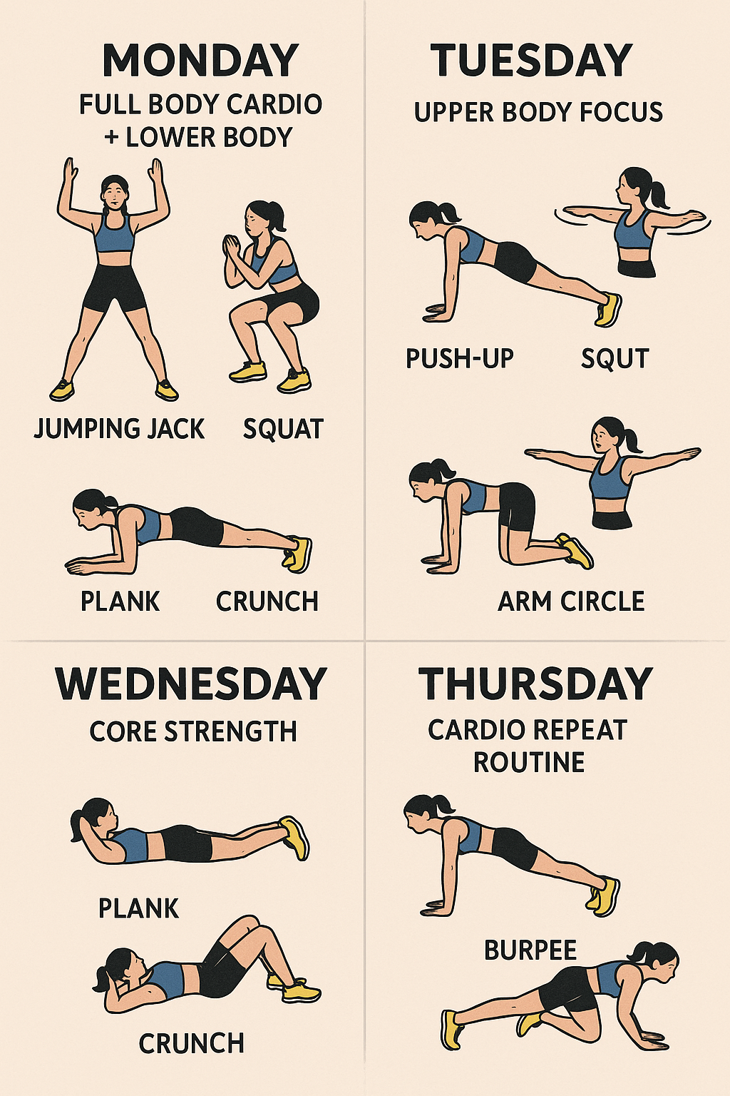 ✅ 일주일 홈트 루틴 예시 (전신 중심)