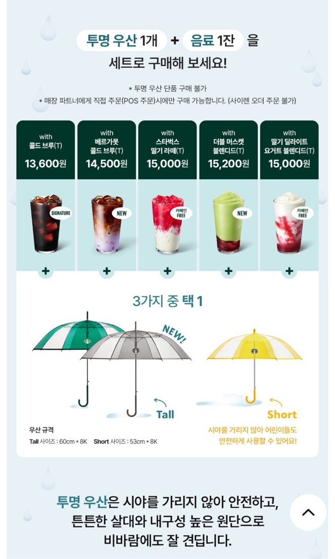 스타벅스 투명 우산 + 음료 세트가 새로운 디자인과 다양한 음료 구성으로 돌아왔습니다.